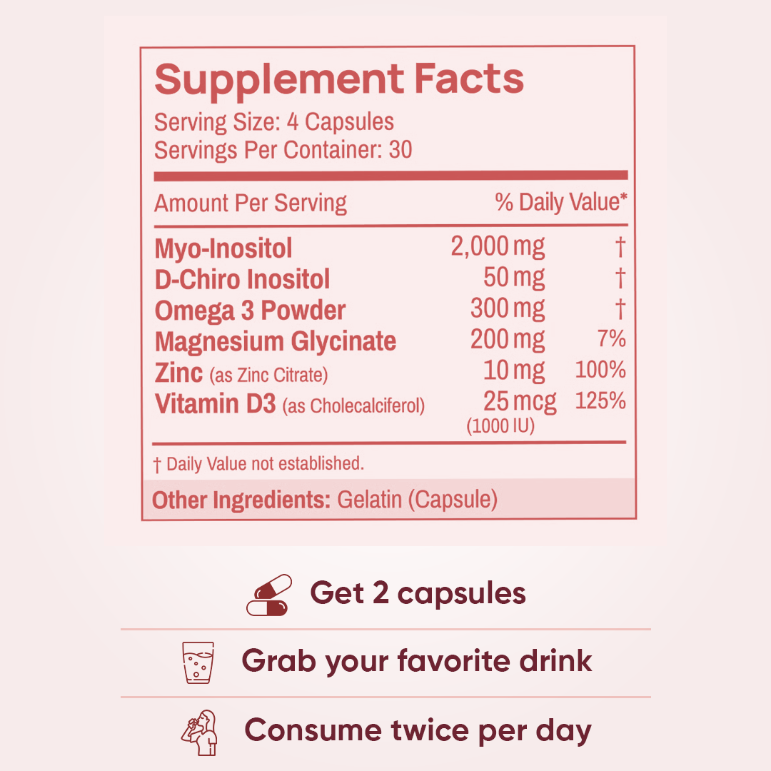 The cofactors that make it work — Magnesium, Zinc, D3, and Omega-3. These are the nutrients your cells need to actually use the inositol you're taking. Without them, you're only getting part of the solution.
