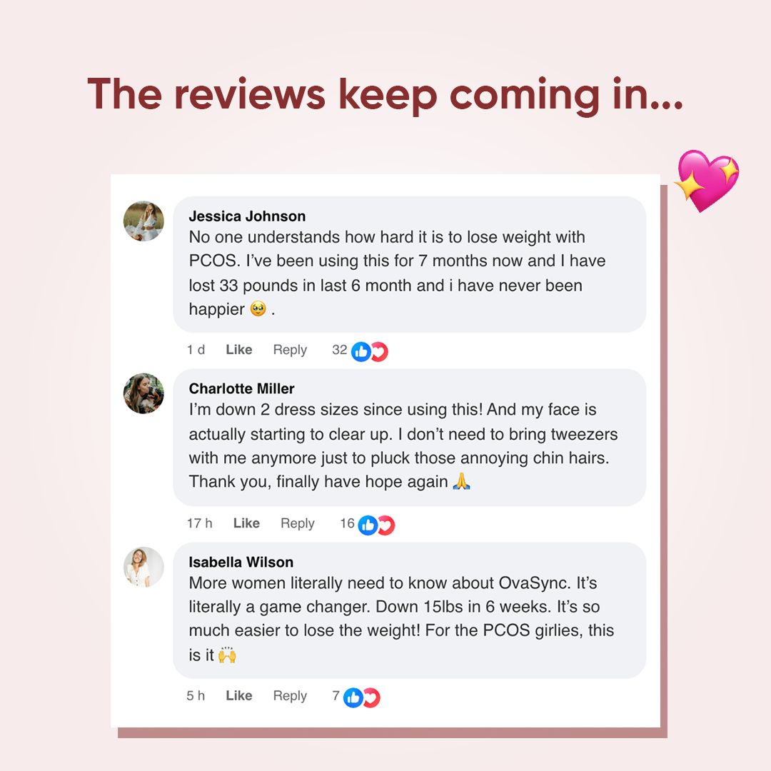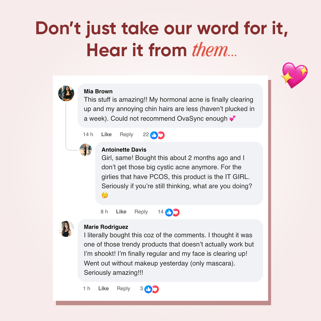 These symptoms are often driven by the same root issue: insulin resistance causing elevated androgens. OvaSync targets this pathway directly with the 40:1 inositol ratio and Zinc for androgen metabolism support. While we can't promise specific symptom resolution (every body is different), addressing the underlying hormonal imbalance is where lasting change begins. Most women see skin and weight-related improvements after 6–8 weeks of consistent use.